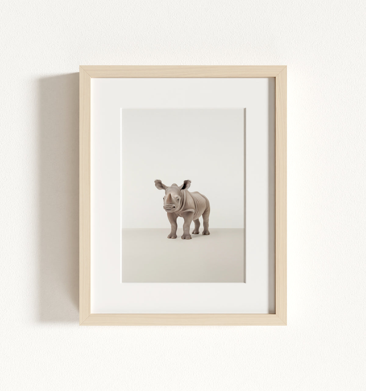 Studio Rhino: a captivating portrait of a young rhinoceros in a serene studio setting. The neutral color palette and expressive personality will enhance any room and add character to a child's space, perfect for animal-lovers of all ages.