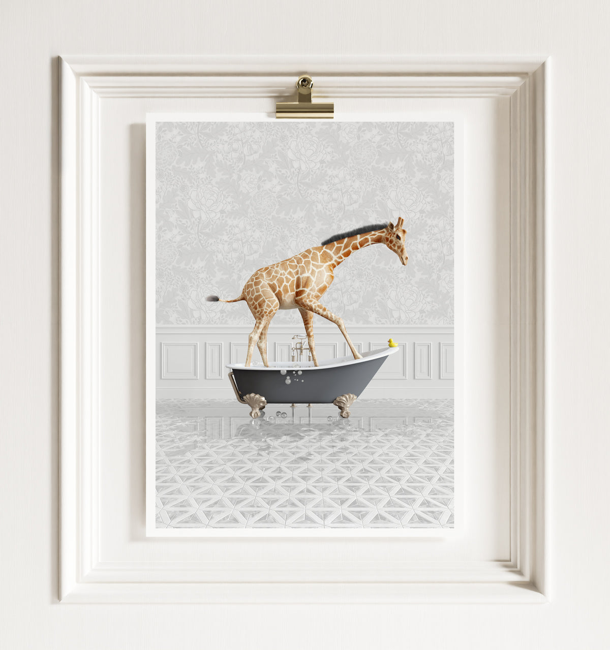A portrait of a giraffe in a charcoal gray vintage clawfoot bathtub. A perfect conversation piece for any room in your home.