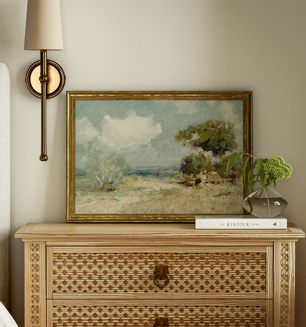 A serene scene of prairie by the seaside, digitally reimagined vintage artwork.
