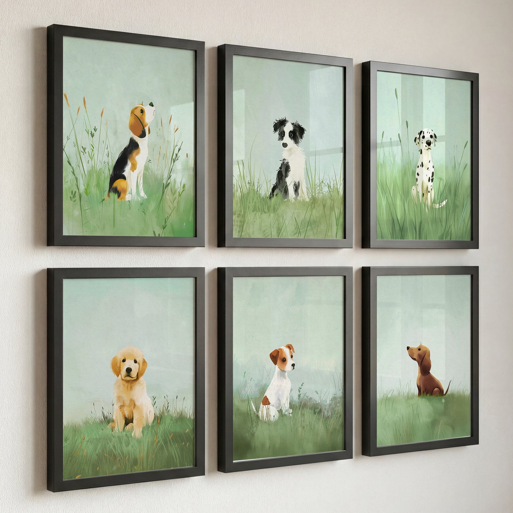 A series of framed nursery art picture prints featuring illustrated puppies arranged on a wall above a crib in a nursery room. The Crown Prints A series of framed nursery art picture prints featuring illustrated puppies arranged on a wall above a crib in a nursery room. The Crown Prints